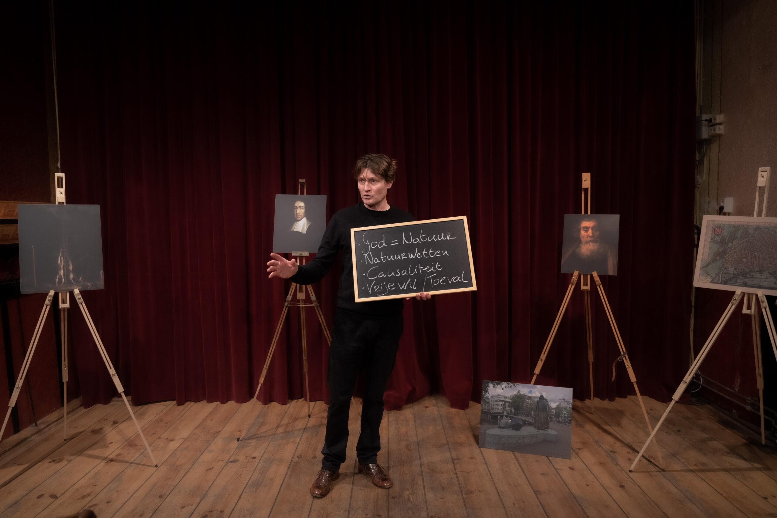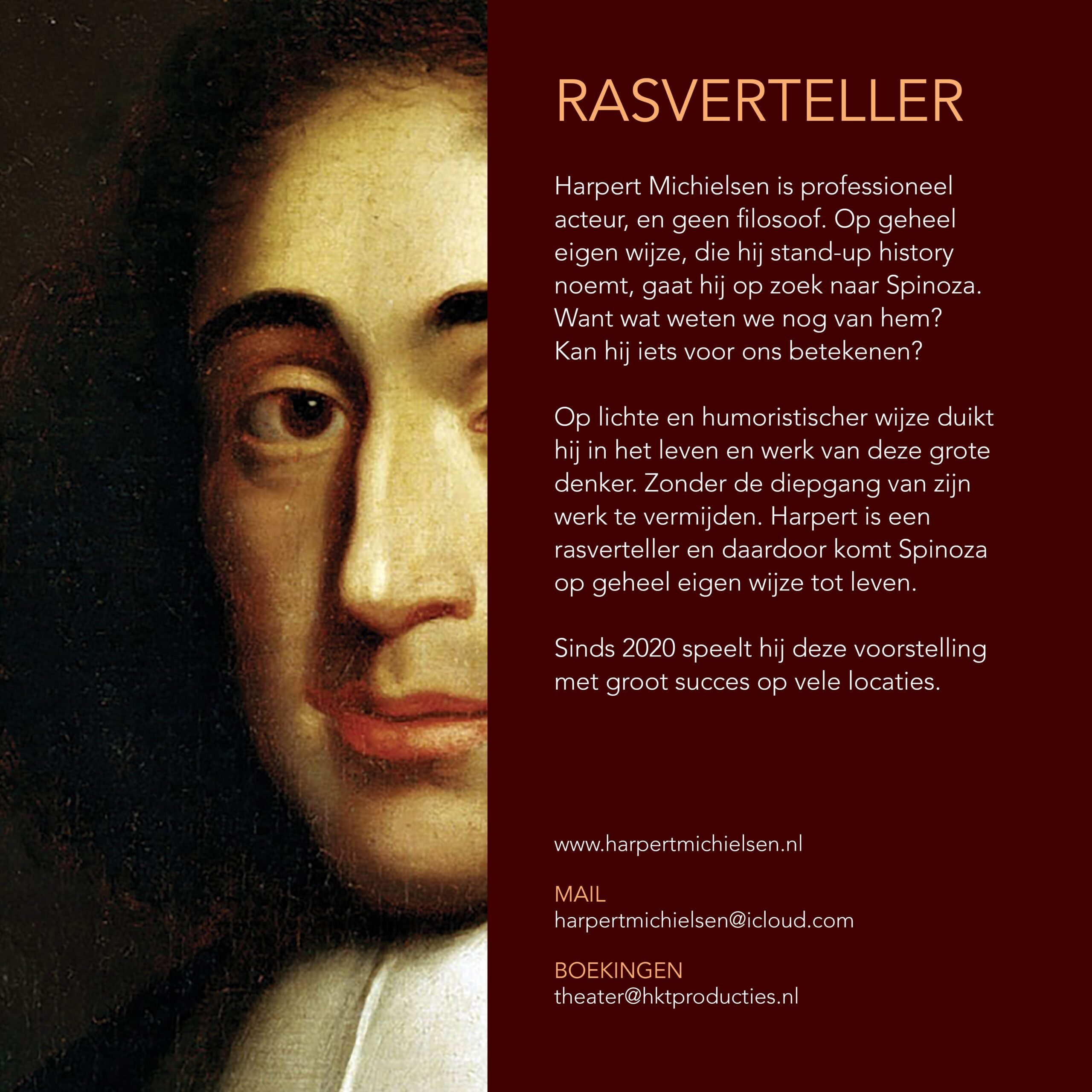 Harpert Michielsen is zelf geen filosoof, maar theatermaker, waardoor hij het werk van Spinoza bekijkt als een nieuwsgierige leek. Hij neemt het publiek mee in een wonderlijke ontdekkingstocht door het leven en denken van deze nieuwe Nederlander uit de 17e eeuw.